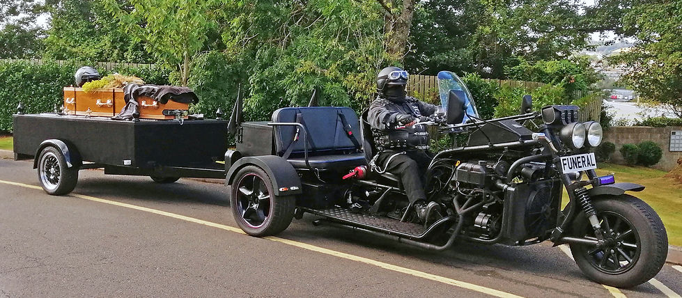 My custom-built three-wheeled motorcycle is powered by a Ford Scorpio 2.9 litre fuel injected V6 engine and draws a specially made open-top bier, on which the loved one's coffin rests, giving an unhindered view of it from all sides during the funeral procession and after. Do not worry if it is raining; a microfiber towel is carried to dry the coffin, which takes less than one minute. All in black, twenty-five feet in length, and with a pair of straight-through three-into-one exhausts that makes heads turn, my aim is to give the ultimate last ride for a biker or motorcycle enthusiast.